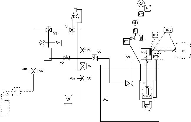 cylinder, DC degassing cell, EC equilibrium cell, EV electrovalve, GC gas