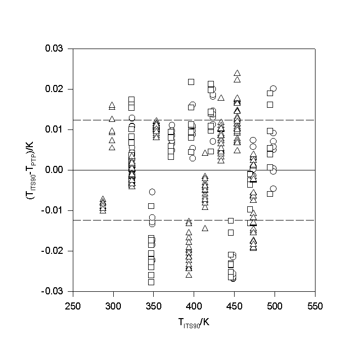 Figure 2.Results of the calibration (second order polynomial regression) of a platinum probe, TITS90 - Tcal. over a period of 6 months: O, Jan. 15 1998, D , April 10, 1998, , June 15, 1998, ---, standard deviation.